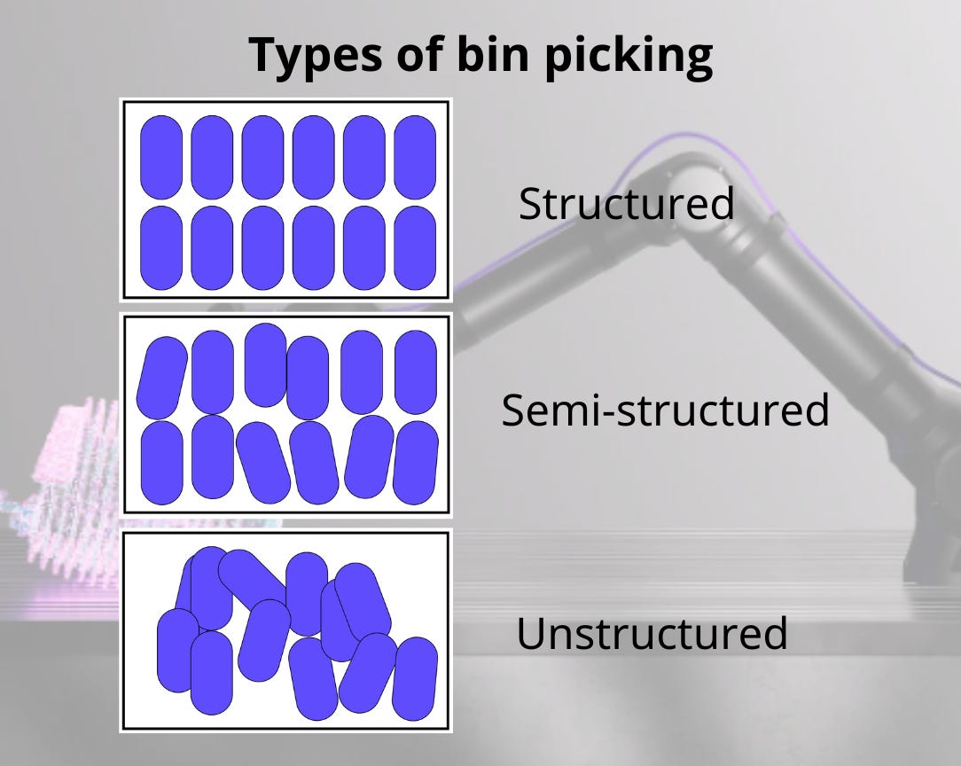 While pick-and-place and bin-picking both involve relocating items, pick-and-place operates in a structured environment with known positions. In contrast, bin-picking manages randomly placed items in an unstructured environment.
